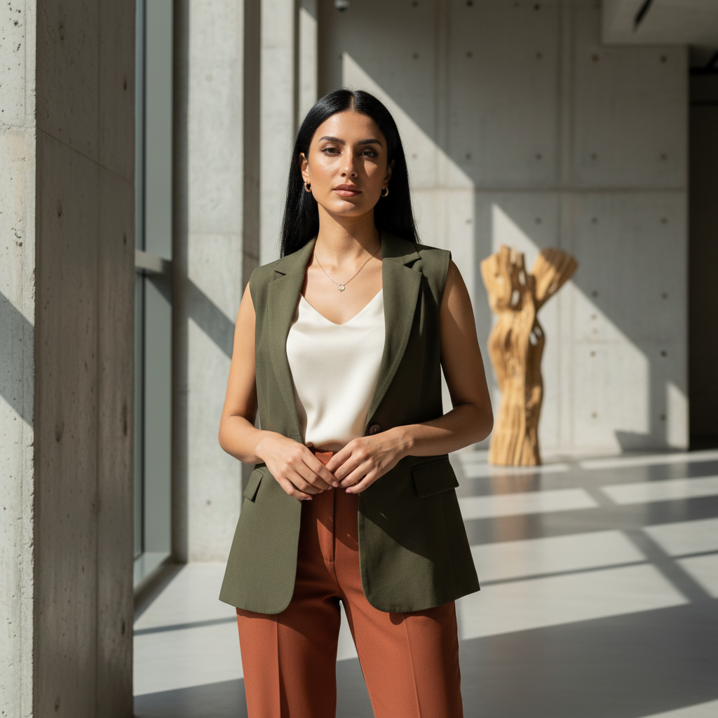 מודל, אישה: לבוש עסקי-אלגנטי, חליפת מכנסיים מחויטת בצבעי אדמה, טופ משי, תכשיטי זהב מינימליסטיים; לוקיישן אורבני יוקרתי, קירות בטון חשופים; תאורת יום טבעית רכה, אווירה מתוחכמת ונקייה.התמונה תכיל רק אדם אחד.