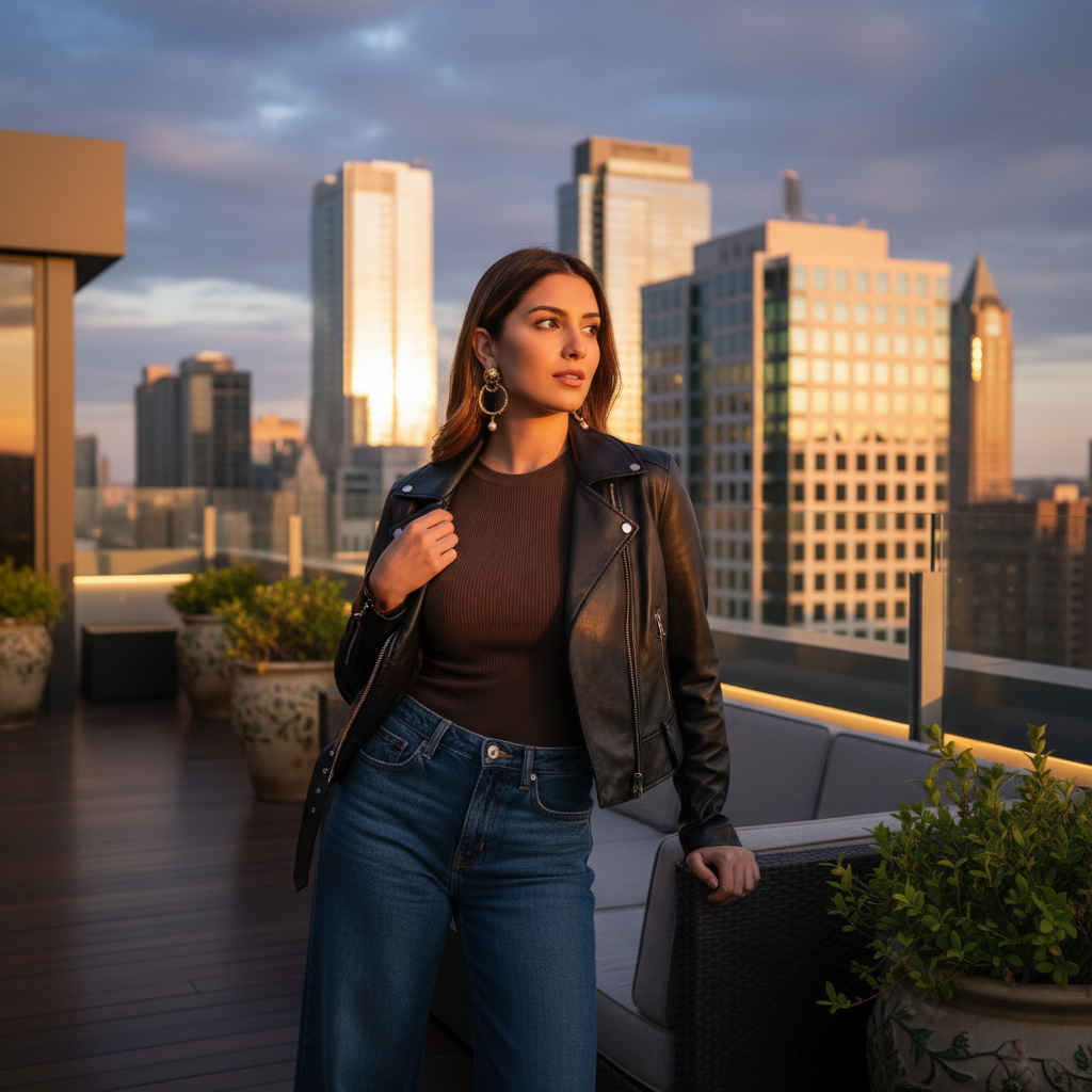 מודל, אישה: לבוש קז'ואל-יוקרתי, ג'ינס בגזרה רחבה, טופ סריג כהה, ז'קט עור שחור, עגילים בולטים; טרסת גג יוקרתית על רקע קו רקיע עירוני; תאורת שקיעה רכה ודרמטית, אווירה מסתורית ואלגנטית.התמונה תכיל רק אדם אחד.