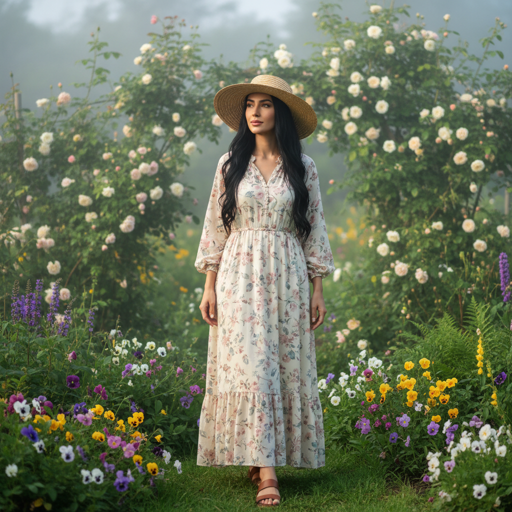 מודל, אישה: לבוש בוהו-שיק, שמלת מקסי פרחונית בהירה, סנדלים שטוחים, כובע קש רחב שוליים; גן ירוק שופע עם פרחים; תאורת בוקר רכה ומפוזרת, אווירה שלווה וטבעית.התמונה תכיל רק אדם אחד.