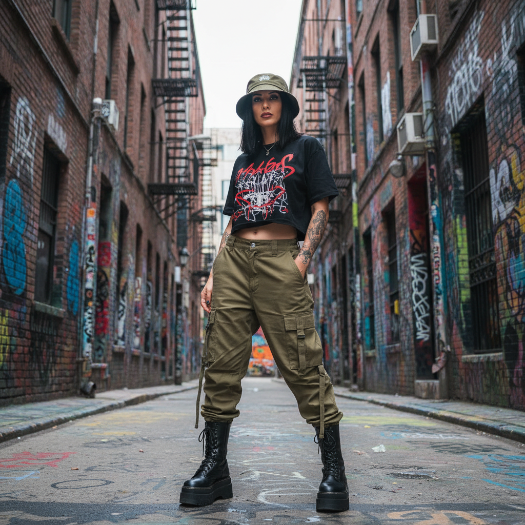 מודל, אישה: לבוש סטריט-וור אורבני, מכנסי קרפגו רחבים זית, קרופ טופ שחור גרפי, מגפונים מסיביים, כובע באקט; סמטה אורבנית צבעונית עם גרפיטי; תאורת יום קודרת, אווירה קשוחה ובועטת.התמונה תכיל רק אדם אחד.