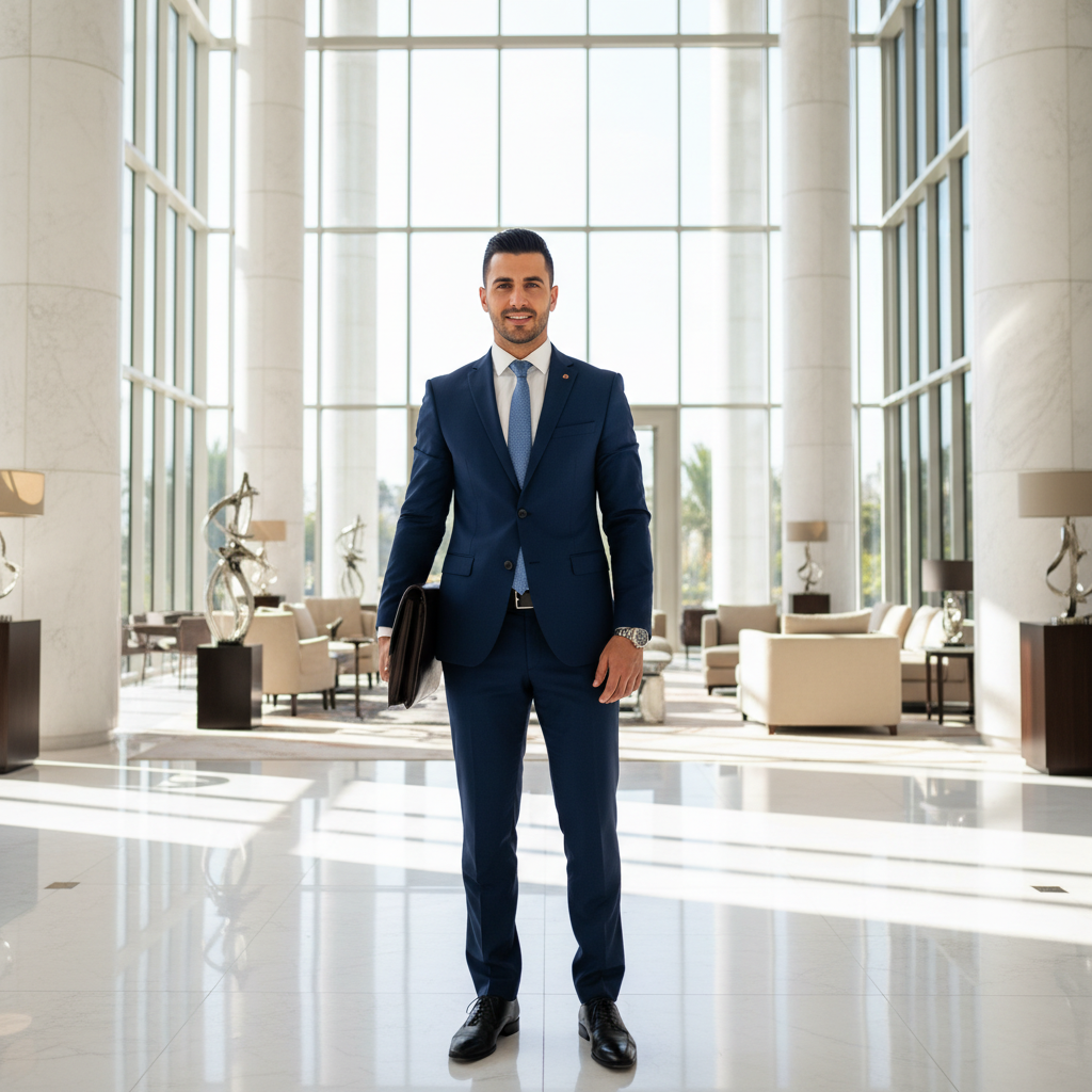 מודל, גבר: לבוש עסקי-מודרני, חליפה מחויטת כחולה כהה, חולצה לבנה, עניבה דקה, נעלי עור מבהיקות; לובי מודרני יוקרתי מזכוכית ושיש; תאורת יום טבעית בוהקת, אווירה בטוחה ומקצועית.התמונה תכיל רק אדם אחד.